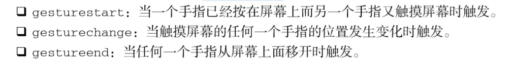 触摸事件也会返回 rotation 和 scale 属性,但这两个属性只会在两个手指与 屏幕保持接触时才会发生变化。一般来说,使用基于两个手指的手势事件,要比管理 触摸事件中的所有交互要容易得多。