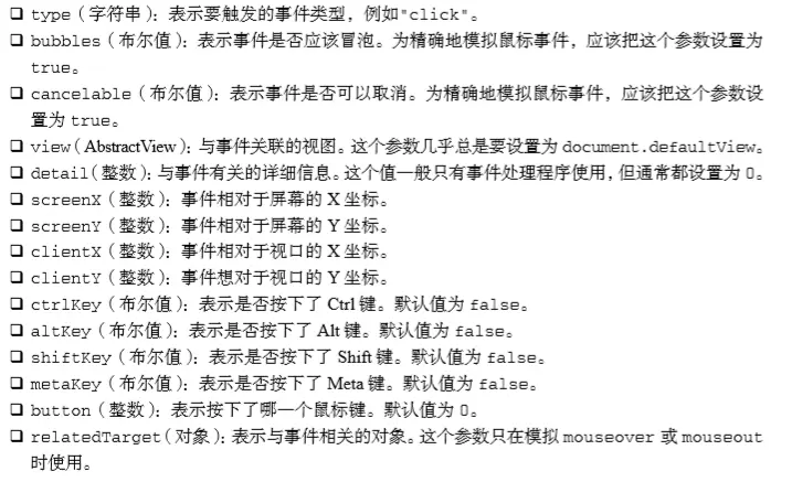 创建新的鼠标事件对象并为其指定必要的信息,就可以模拟鼠标事件。创建鼠标事件对象的方法是 为 createEvent()传入字符串"MouseEvents"。返回的对象有一个名为 initMouseEvent()方法, 用于指定与该鼠标事件有关的信息。这个方法接收 15 个参数,分别与鼠标事件中每个典型的属性一一 对应