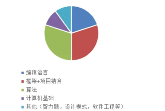 从上图不难看出,面试考察的各项内容大致上可以分为三项:算法、项目、基础知识(编程语言+计算机基础等)。