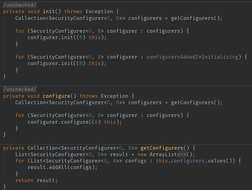 WebSecurityConfigurerAdapter是一个安全配置器,我们知道建造者在performBuild()之前都会把循环调用安全配置器的init();configure();方法,然后创建HttpSecurity并放入自己的securityFilterChainBuilders里。