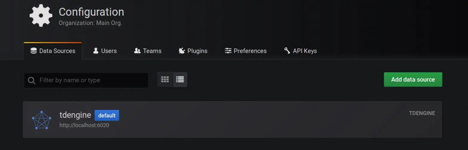 - 然后,就可以在Grafana的数据源列表中看到刚创建好的TDengine的数据源