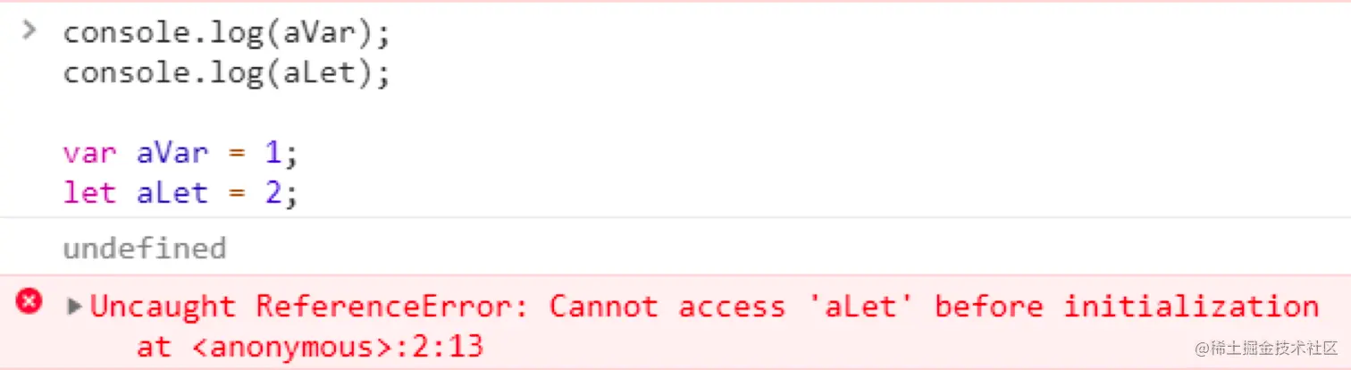 aVar的值符合提升的原则。aLet就有点意思了,它抛出来的错误实际上就是暂时死区错误。简单来说,从声明到到let的运算步骤为止的这段时空被锁死,外界在此期间寻求访问,不被允许。