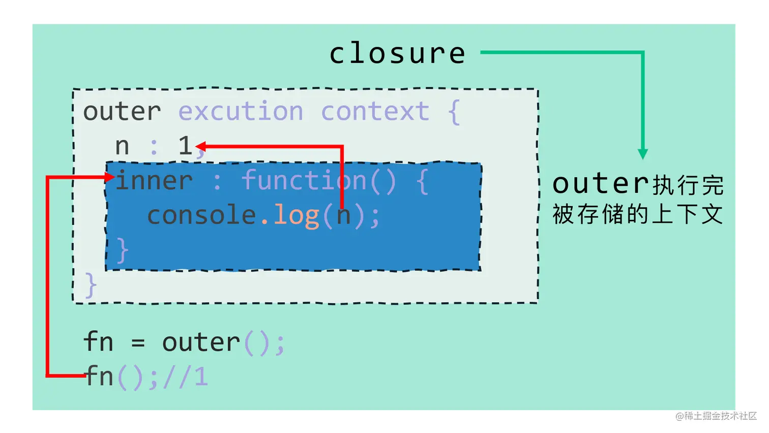 简单来说outer执行完毕后形成了闭包,闭包记录下来了outer的执行上下文。fn执行时依然可以访问到本来应该消亡掉了的outer里面的变量。看图理解: