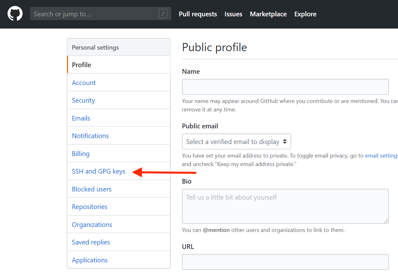 点击 SSH and GPG keys 进入绑定秘钥的页面