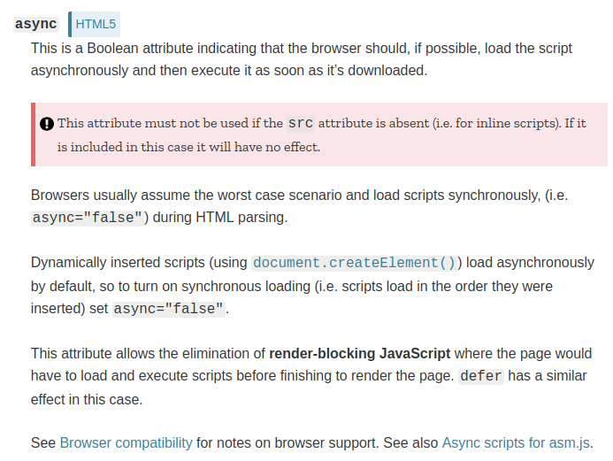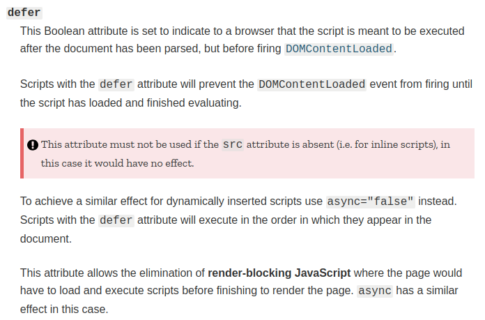 script标签中defer,async属性区别 三千世界君 2019-09-29 995 阅读1分钟 MDN关于defer和async属性的说明如下:1. 不设置async和defer属性, 那么脚本会同步下载并执行, 阻塞后续dom的渲染2. 设置了defer属性。脚本异步加载,加载完后,在触发domContentLoaded事件之前执行。3. 设置了async属性。脚本异步加载, 加载完后,立即执行,并阻塞后续dom渲染。不影响domContentLoaded事件的触发