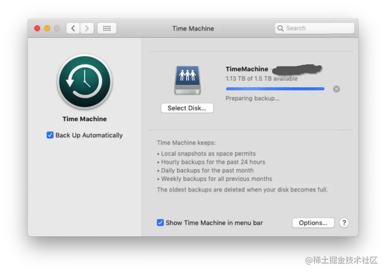 Time Machine将运行第一次备份,之后每小时如果macbook插着电源都会进行备份。(温馨提示,macbook最好连网线 以及 和树莓派使用同一个千兆交换机,否则使用wifi或者网线经过路由器,路由器太渣的话有可能拖垮家里的网速)