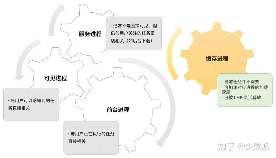每个应用都有各种各样的组成部分,其中特定组件的运行状态共同组成了一套供 LMK 进行内存回收的「优先级」参考,包括:前台进程、可见进程、服务进程和缓存进程。