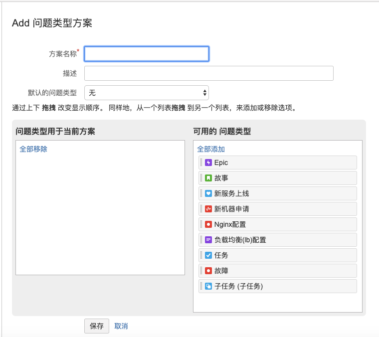 选择问题类型>问题类型方案,进入问题类型方案设置页面,点击右上角“添加问题类型方案”,进入问题类型方案编辑页面,如下图。把需要的问题类型从右侧拖动到左侧框里,点击保存,完成添加。
