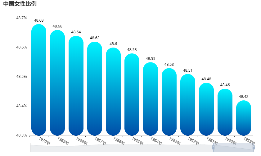 我这里还做了柱状图,同样可以看到在60年到70年这十年里,女性比例的增长还是非常明显的