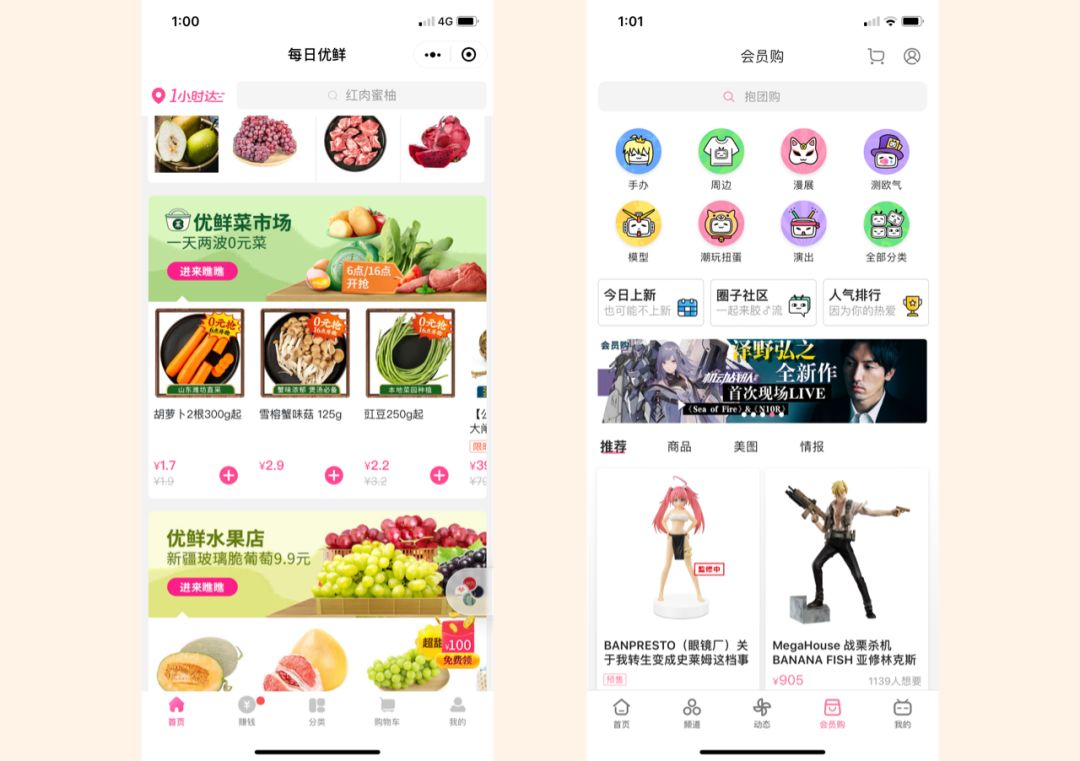 1、「使用目标用户的语言」 用户在使用产品的过程中,其大脑会“优待”较常用的记忆内容和操作形式,有意抑制那些相似但不常用的内容,以便减轻认知负担,防止混淆。这种习惯从某种程度上来说属于“熟知记忆”。简单讲就是说人话,使用目标用户的熟悉的语言「图形、配色、风格」,不需要故作高深,就像张小龙说的,做产品要有傻瓜心态。 下图中,每日优鲜的「菜市场」、「水果店」,B站的「手办」等等,都是其目标用户的语言:“The system should speak the users’ language, with words, phrases and concepts familiar to the user, rather than system-oriented terms. Follow real-world conventions, making information appear in a natural and logical order.”