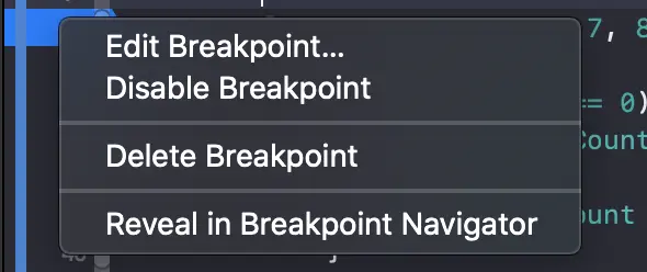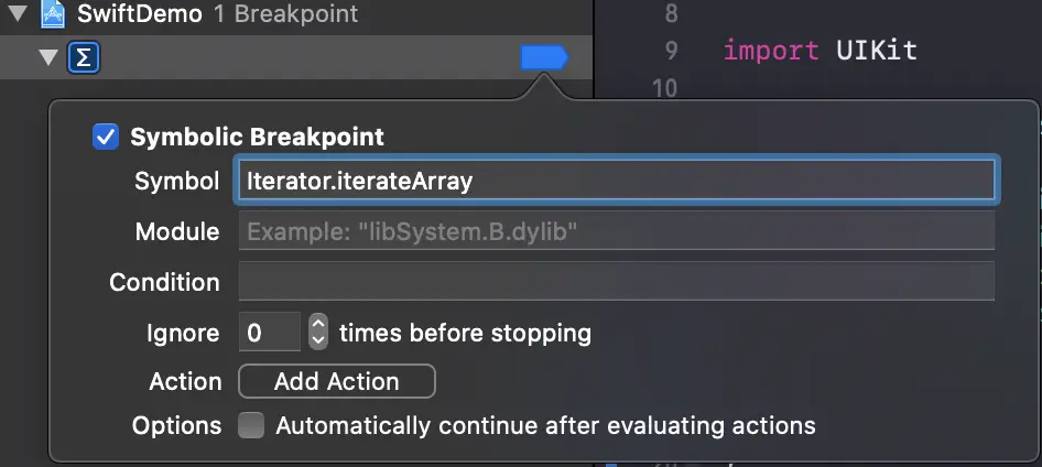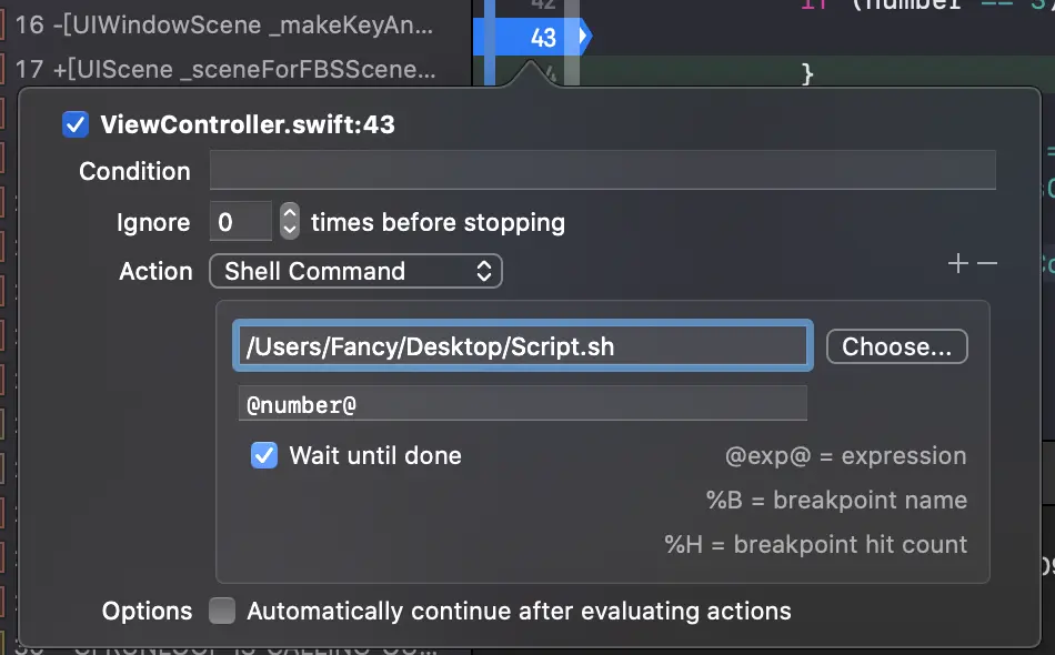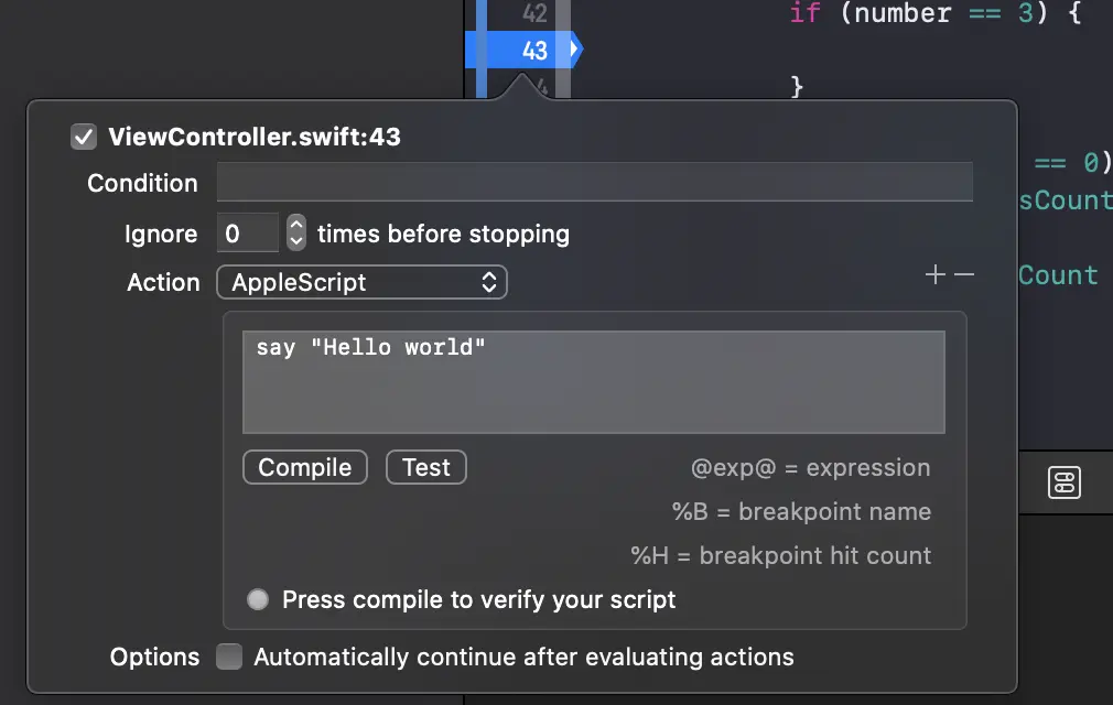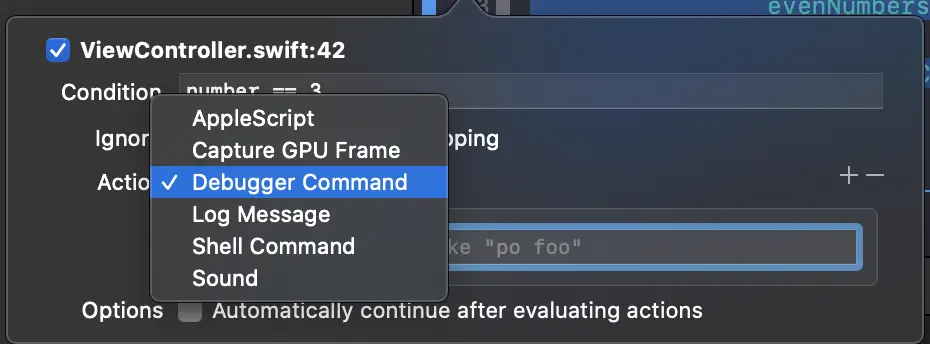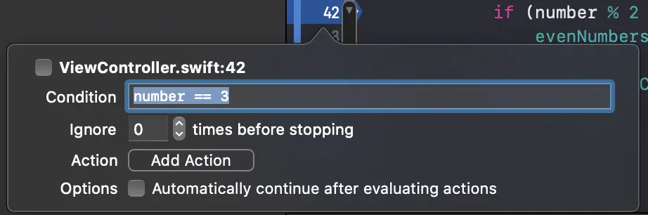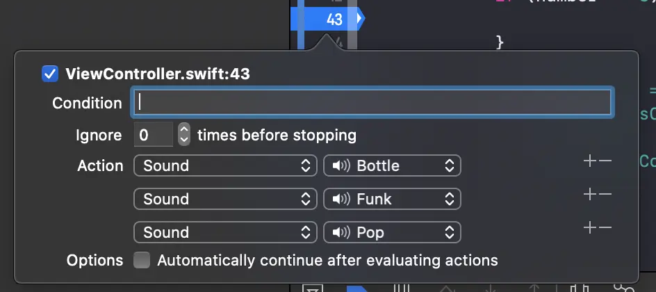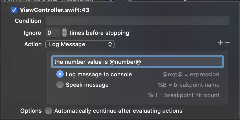 最后一个可用的选项是“Continue After Evaluating”。启用此选项后,断点不会暂停执行。与操作结合使用时很有用,因为我们很可能会有一些不应暂停应用程序执行的操作。