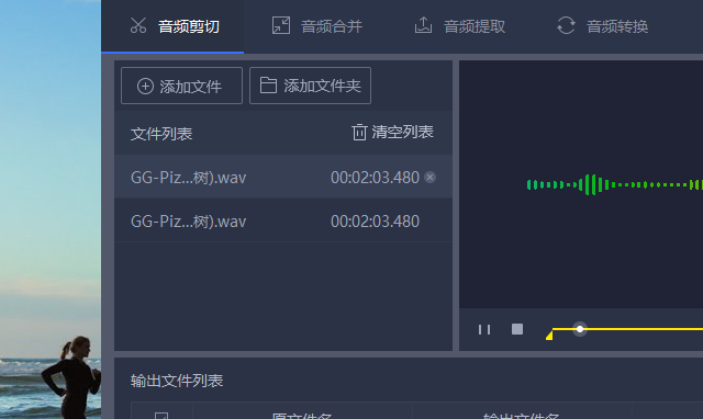 1、首先就是基本的操作,先选择软件功能为音频剪切,然后就是把需要剪辑的音频文件添加到迅捷音频转换器当中,可以点击软件左上角的添加文件按钮或者点击添加文件夹将wav音频导入其中。