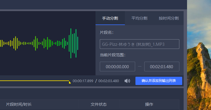 2、然后就是开始剪切音频文件了。在软件右侧有三个选项:手动分割、平均分割和按时间分割。然后就是选择输出文件的名称和剪切到时间段,然后完成之后点击确认并添加到输出列表。