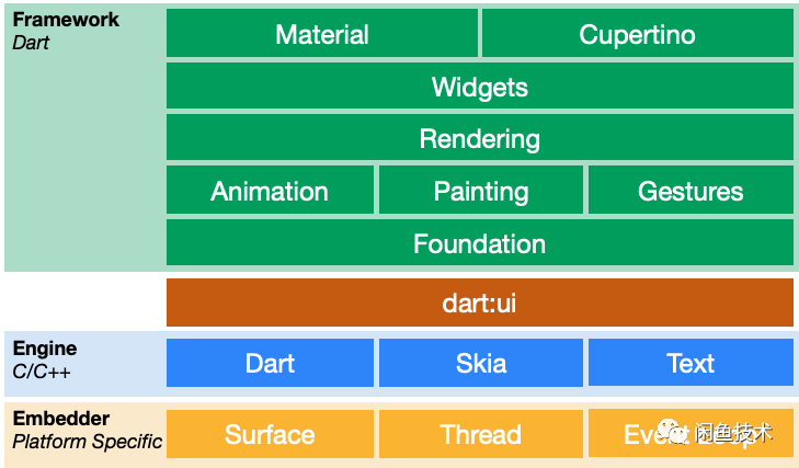 那么Flutter Web是怎么做到这一切的呢?这就要从Flutter的原理说起。Flutter框架的设计如下所示: