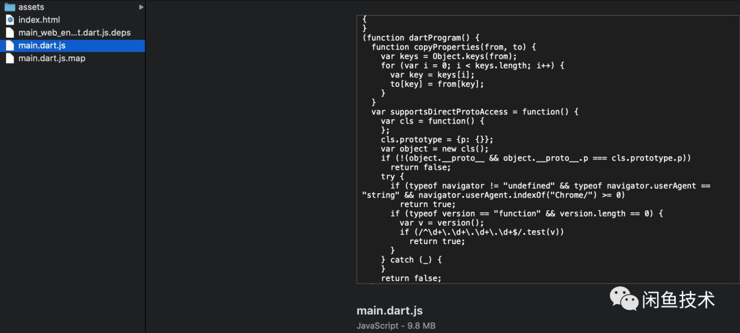 可以看到此js代码可读性很差(变量名,格式等),大小为2.2MB。这是因为flutter构建过程中开启了dart2js命令的O4优化项所致。为了方便我们分析和调试,我们对此其进行如下修改: