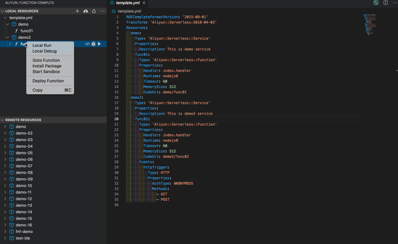 ctrl/⌘ c,再右键服务名选择黏贴或单击服务名后按ctrl/⌘ v,即可将指定函数在模版文件 template.yml 中的相关描述定义拷贝到指定服务下。