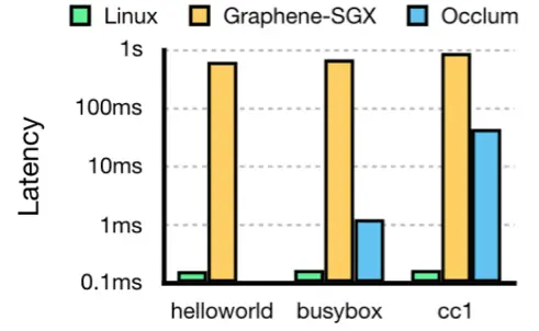①进程启动慢:Graphene-SGX 要为每个 LibOS 进程创建一个单独的 enclave,而创建 enclave 的开销非常高,因此 Graphene-SGX 的 LibOS 进程启动极慢(比 Linux 启动进程慢接近 10,000 倍)。