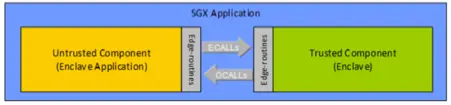 以 SGX 为例,其中一种方法是利用 Intel SGX SDK。如下图所示,基于 SGX SDK 的应用程序分为两部分:Enclave 外的不可信组件(左边黄色部分)和 Enclave 内的可信组件(右边绿色部分)。两边可以通过跨 Enclave 的函数调用通信:不可信组件可以通过 ECall 调用可信组件中定义的函数;反之,可信组件也可以通过 OCall 调用不可信组件中定义的函数。