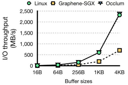 ②IPC 开销低:Occlum 的进程间通信带宽是 Graphene-SGX 的 3 倍(图 5);