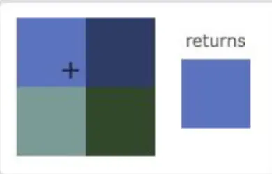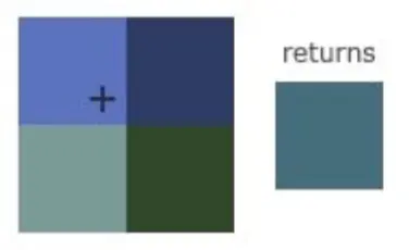 如图2,线性过滤会把这个纹理坐标周围的纹理单元的加权平均值应用到这个纹理坐标上(线性插值),一个纹理像素的中心距离纹理坐标越近,那么这个纹理像素的颜色对最终的样本颜色的贡献越大。下图中你可以看到返回的颜色是邻近像素的混合色: