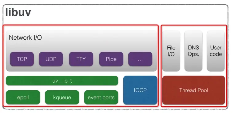 上图左侧是libuv的两大基石:event-loop线程和thread pool。而从图的右侧有两条轨迹分别连接到这两个基石,我特别用红色加粗标记,可以看到: