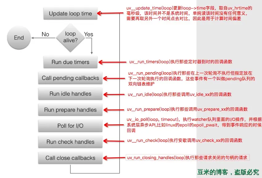 整个事件循环的执行主体是在uv_run中,每一次的循环经历的阶段对应的函数在上图中已经标注出来,有几个重点要说一下: