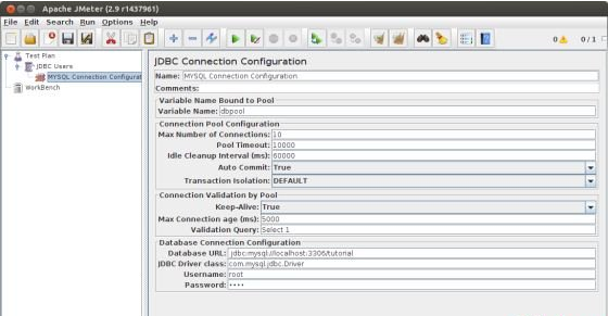 现在,我们已经定义了我们的用户,它是时间来定义,他们将要执行的任务。在本节中将指定JDBC请求执行。 JDBC Users元件上右击,选择 Add > Config Element > JDBC Connection Configuration.