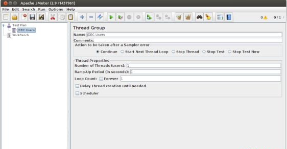 现在,创建一个线程组,右键点击 Test Plan > Add> Threads(Users)> Thread Group. 根据测试计划节点将添加线程组。重命名此线程为JDBC用户。