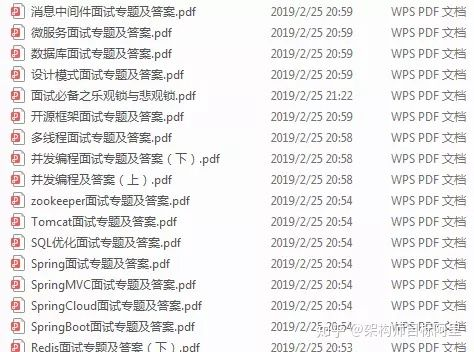 这份面试题包含了十九个模块:Java 基础、容器、多线程、反射、对象拷贝、Java Web 模块、异常、网络、设计模式、Spring/Spring MVC、Spring Boot/Spring Cloud、Hibernate、Mybatis、RabbitMQ、Kafka、Zookeeper、MySql、Redis、JVM 。如下图所示: