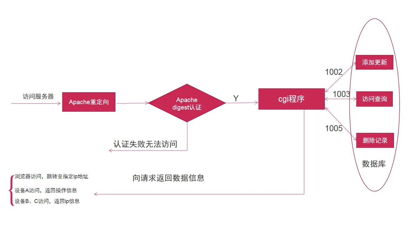 如图所示,服务器在接收到请求后,需要进行用户认证,认证通过后才能跳转至cgi程序进行数据库操作,信息获取等。
