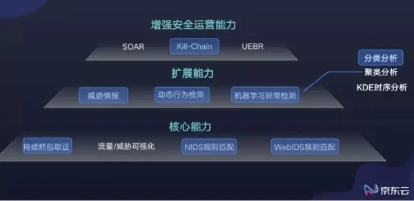 态势感知首先通过网络层面进行决策,通过搜集了大约十款产品来进行调研分析,发现网络层面的能力主要有核心能力、扩展能力和增强安全运营能力。