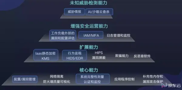 扩展能力中的行为监控HIDS/EDR能力是云端主机层面防护软件中最重要的,其它还包括静态加密KMS、HIPS漏洞屏蔽、欺骗能力和反恶意软件。增强安全运营能力包括工作负载外部的漏洞和配置评估、IAM/MFA、日志管理和监控。未知威胁检测能力需终端集成威胁情报、AI/沙箱云查杀。