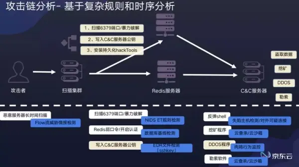 那复杂规则关联分析是什么样的呢?首先黑客会使用扫描集群,扫描RDS端口进行暴力破解。如果未授权访问上控制云服务器的基础服务器,便会将公钥写入基础服务器,之后就能自动化操作,比如说装一些黑客工具、DDoS工具或挖矿、勒索工具。
