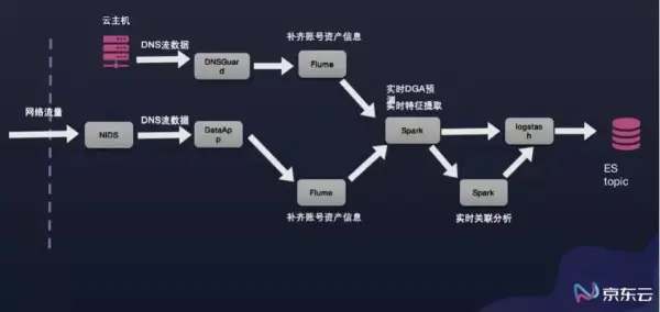 首先检测通过两条路,第一条路是NIDS的DNS流数据,通过程序补齐账号之后发到Spark里面进行特征提取匹配,然后进行预测;第二条路是云主机上,比如说自己设定了公网DNS解析的话,它发送的数据也是通过DNS解析来进行补齐资产来进行实时检测。