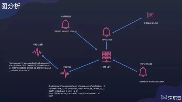 通过时间推移的方式,通过上下文关联来进行检测,关联之后发现了一条命令行审计规则,也就是通过其中一个可疑进程来下载了挖矿的脚本并且运行了。挖矿脚本的副进程是用户自己创建的一个Hadoop的进程,也就是Yarn进程。Yarn进程其实是Hadoop未授权访问的RCE的漏洞。同时通过扫描器来进行扫描检测这台主机,发现这台主机确实存在Hadoop RCE的漏洞,这便是自动化攻击溯源,里面的核心技术就是图分析的技术。