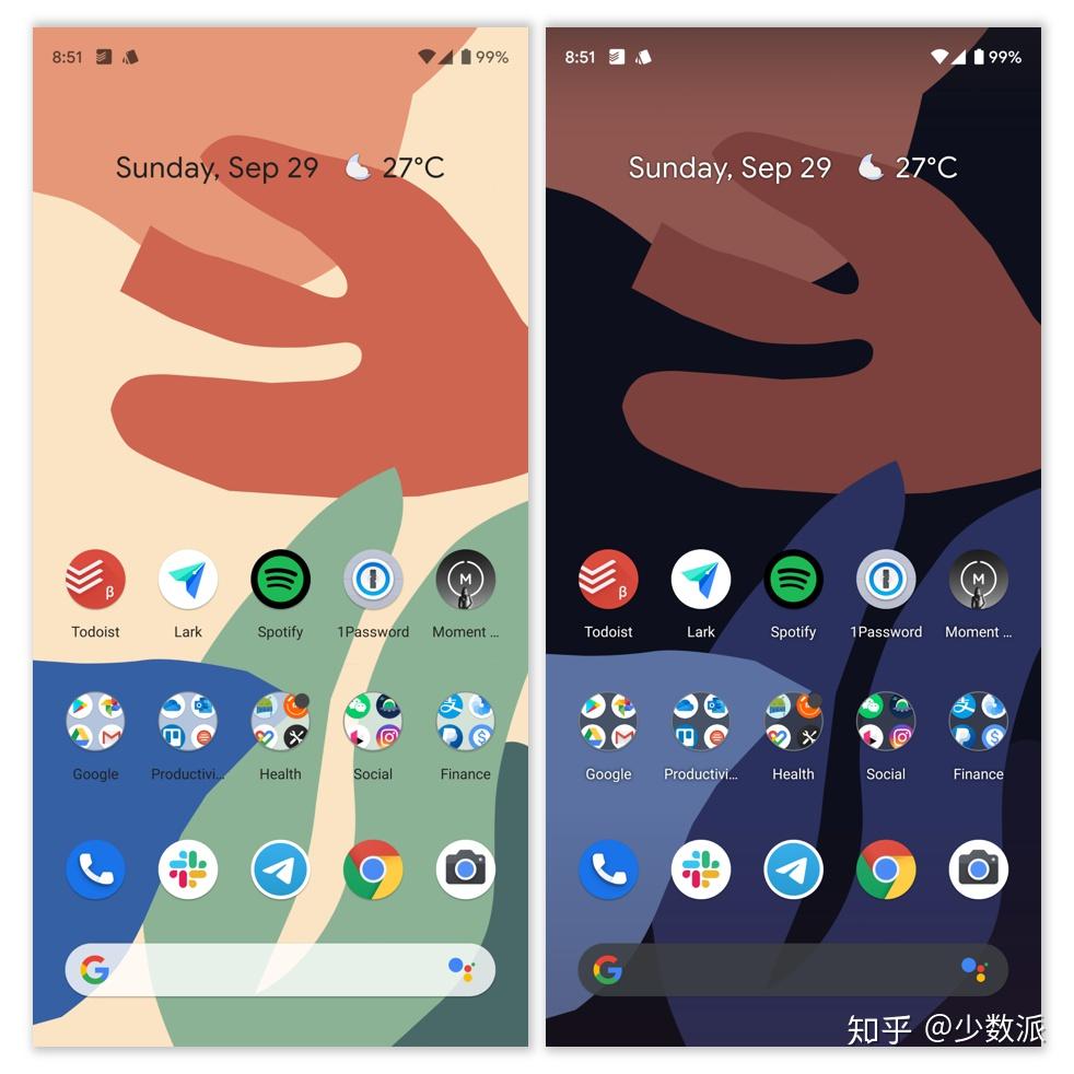 最后,第一组动态壁纸和第三组动态壁纸还会根据系统的暗色主题状态在明/暗两种主题间自动切换,解决了前几代部分动态壁纸不适合夜间使用/白天使用可视度较低的问题,但 Pixel 4 动态壁纸的明暗主题切换功能也有一定限制,这个我们在下一部分细说。