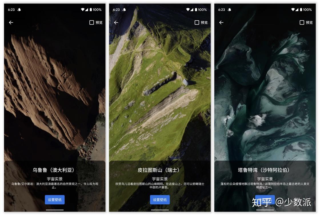 第二组动态壁纸延续 Pixel 系列动态壁纸的一贯风格,包含澳大利亚乌鲁鲁(艾尔斯岩)、瑞士皮拉图斯山和沙特阿拉伯塔鲁特湾三个地点的高空航拍动态壁纸。