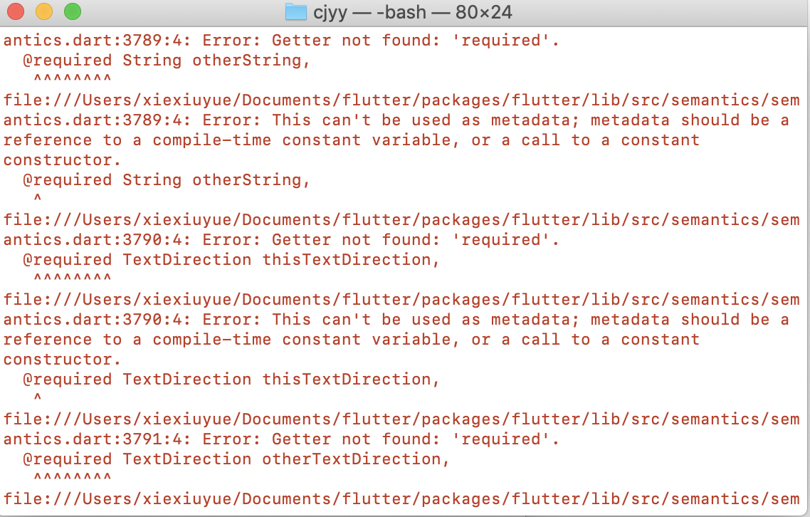 然后我输入flutter run,等待运行,然后报错了。