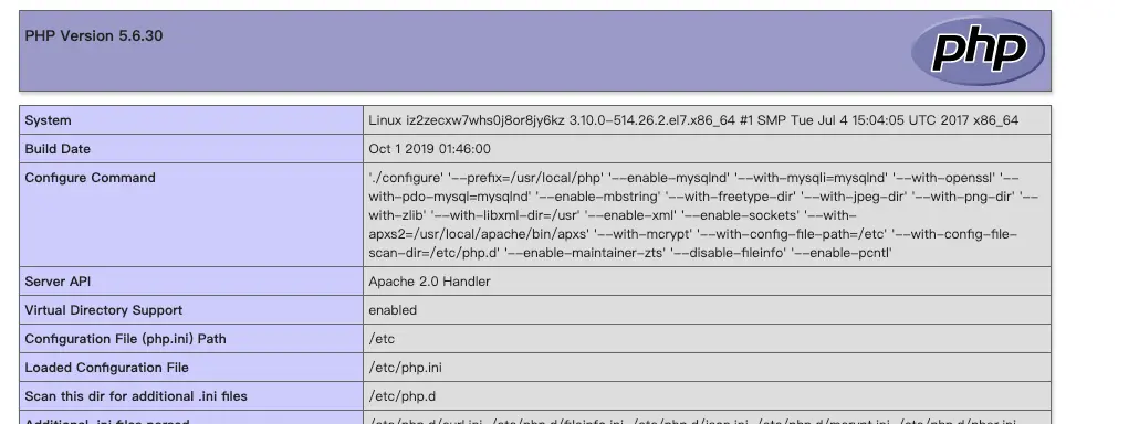 cd /usr/local/src/ wget http://zy-res.oss-cn-hangzhou.aliyuncs.com/php/php-5.6.30.tar.gz tar zxvf php-5.6.30.tar.gz cd php-5.6.30 ./configure --prefix=/usr/local/php --enable-mysqlnd --with-mysqli=mysqlnd --with-openssl --with-pdo-mysql=mysqlnd --enable-mbstring --with-freetype-dir --with-jpeg-dir --with-png-dir --with-zlib --with-libxml-dir=/usr --enable-xml --enable-sockets --with-apxs2=/usr/local/apache/bin/apxs --with-mcrypt --with-config-file-path=/etc --with-config-file-scan-dir=/etc/php.d --enable-maintainer-zts --disable-fileinfo --enable-pcntl make && make install -