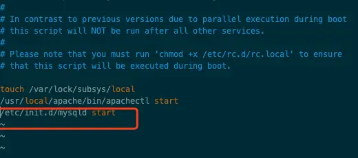 cd /usr/local/mysql/support-files/ cp mysql.server /etc/init.d/mysqld chmod +x /etc/init.d/mysqld # 添加执行权限 vim /etc/rc.d/rc.local添加