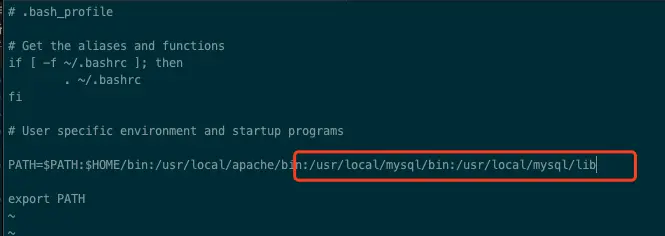 vim /root/.bash_profile # 增加/usr/local/mysql/bin:/usr/local/mysql/lib PATH=$PATH:$HOME/bin:/usr/local/php/bin:/usr/local/mysql/bin:/usr/local/mysql/lib source /root/.bash_profile # 立即生效 -