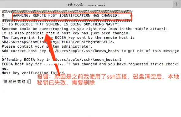 另一种方式就是编辑该文件 vi ~/.ssh/known_hosts,删除对应的一条记录。