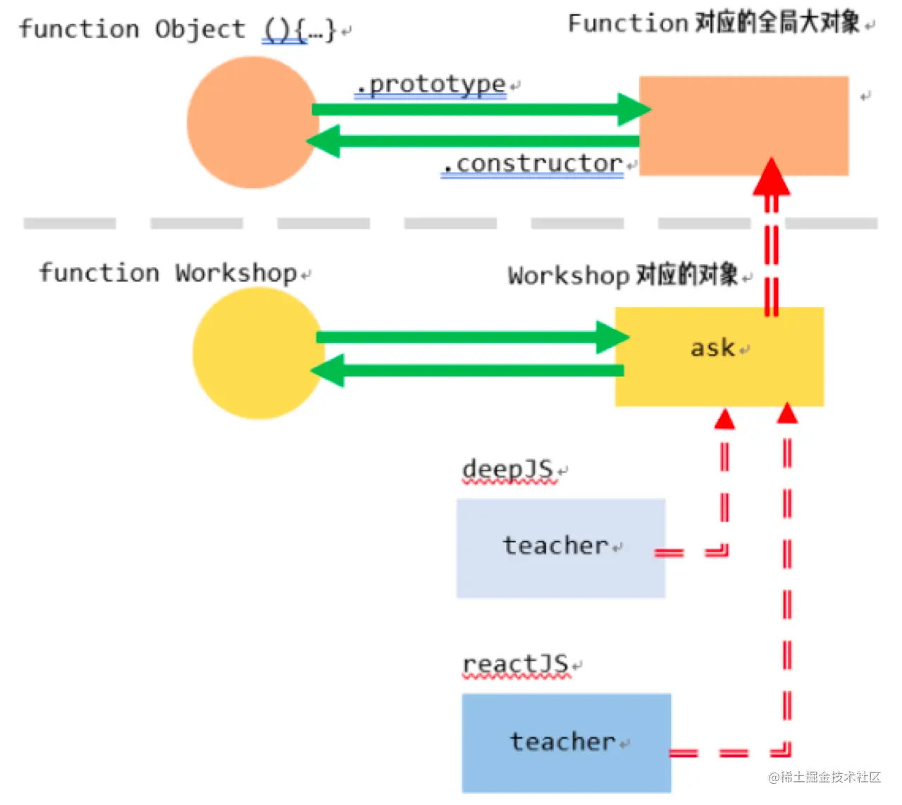 __proto__指向父类的对象,红色箭头;函数通过prototype指向同级对象,绿色右箭头。本例子中:deepJS.__proto__ == Workshop.prototype;上面的原型链布线图非常的重要,请多看几遍好好理解