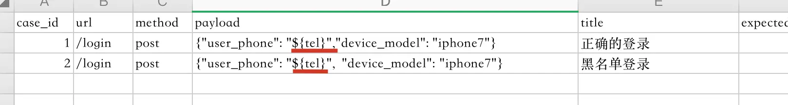 do_excel.py,当读到${tel}用init中的手机号进行替换# encoding: utf-8 from openpyxl import load_workbook import sys reload( sys ) sys.setdefaultencoding('utf-8') from read_config import ReadConfig import project_path from get_data import GetData class DoExcel: @classmethod def get_data(cls,file_name): wb=load_workbook(file_name) mode=eval(ReadConfig.get_config(project_path.case_config_path,"MODE","mode")) #新增代码,读取excel中init的手机号,也可以直接读取excel tel=getattr(GetData,"NoRegTel") test_data=[] for key in mode: sheet=wb[key] if mode[key]=='all': for i in range(2,sheet.max_row+1): row_data={} row_data["case_id"] = sheet.cell(i, 1).value row_data["url"]=sheet.cell(i,2).value row_data["method"]=sheet.cell(i,3).value #新增代码,判断body参数中是否有变量${tel} if sheet.cell(i,4).value.find("${tel}")!=-1: row_data["payload"] = sheet.cell(i, 4).value.replace("${tel}",str(tel)) tel = tel + 1 else: row_data["payload"]=sheet.cell(i,4).value row_data["title"]=sheet.cell(i,5).value row_data["expected"] = sheet.cell(i, 6).value row_data["sheet_name"]=key test_data.append(row_data) #将使用后的tel+1重新写到init,保证每次用到都是新的 cls.update_tel(tel,file_name,'init') else: for case_id in mode[key]: row_data = {} row_data["case_id"] = sheet.cell(case_id+1, 1).value row_data["url"] = sheet.cell(case_id+1, 2).value row_data["method"] = sheet.cell(case_id+1, 3).value if sheet.cell(case_id+1, 4).value.find("${tel}") != -1: row_data["payload"] = sheet.cell(case_id+1, 4).value.replace("${tel}", str(tel)) tel=tel+1 else: row_data["payload"] = sheet.cell(case_id+1, 4).value row_data["title"] = sheet.cell(case_id+1, 5).value row_data["expected"] = sheet.cell(case_id+1, 6).value row_data["sheet_name"] = key test_data.append(row_data) cls.update_tel(tel, file_name, 'init') return test_data @staticmethod def write_back_data(file_name,sheet_name,i,result,TestResult): wb=load_workbook(file_name) sheet=wb[sheet_name] sheet.cell(i,7).value=result sheet.cell(i,8).value=TestResult wb.save(file_name) #保存 #新增代码,新增更新手机号的方法 @classmethod def update_tel(cls,tel,file_name,sheet_name): """更新手机号""" wb = load_workbook(file_name) sheet = wb[sheet_name] sheet.cell(2,1).value=tel wb.save(file_name)