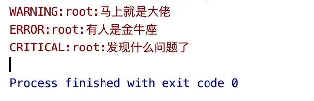 import logging logging.debug("今天天气真好") logging.info("今天天气有点差") logging.warning("马上就是大佬") logging.error("有人是金牛座") logging.critical("发现什么问题了")控制台输出:
