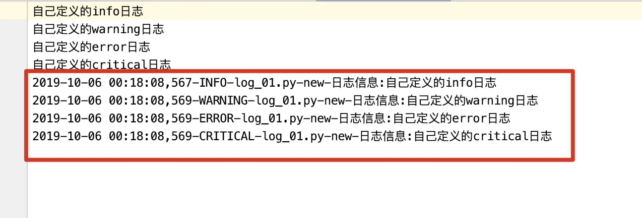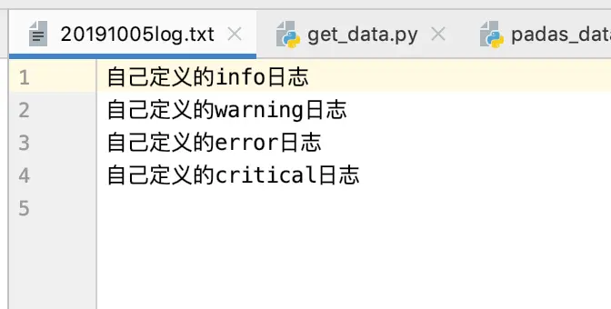 #输出渠道是文件 import logging import sys reload( sys ) sys.setdefaultencoding('utf-8') #定义一个日志收集器 my_logger=logging.getLogger("new") #设定收集的级别,不设定的话,默认收集warning及以上级别的日志 my_logger.setLevel("DEBUG") #创建输出渠道-输出到文件 fh=logging.FileHandler("20191005log.txt",encoding="UTF-8") #设定输出日志的级别 fh.setLevel("INFO") #将收集和输出对接 my_logger.addHandler(fh) #收集日志 my_logger.debug("自己定义的debug日志") my_logger.info("自己定义的info日志") my_logger.warning("自己定义的warning日志") my_logger.error("自己定义的error日志") my_logger.critical("自己定义的critical日志")日志文件: