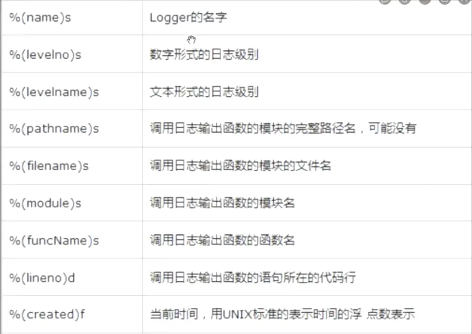 常用格式:·formatter=logging.Formatter("%(asctime)s-%(levelname)s-%(filename)s-%(name)s-日志信息:%(massage)s")