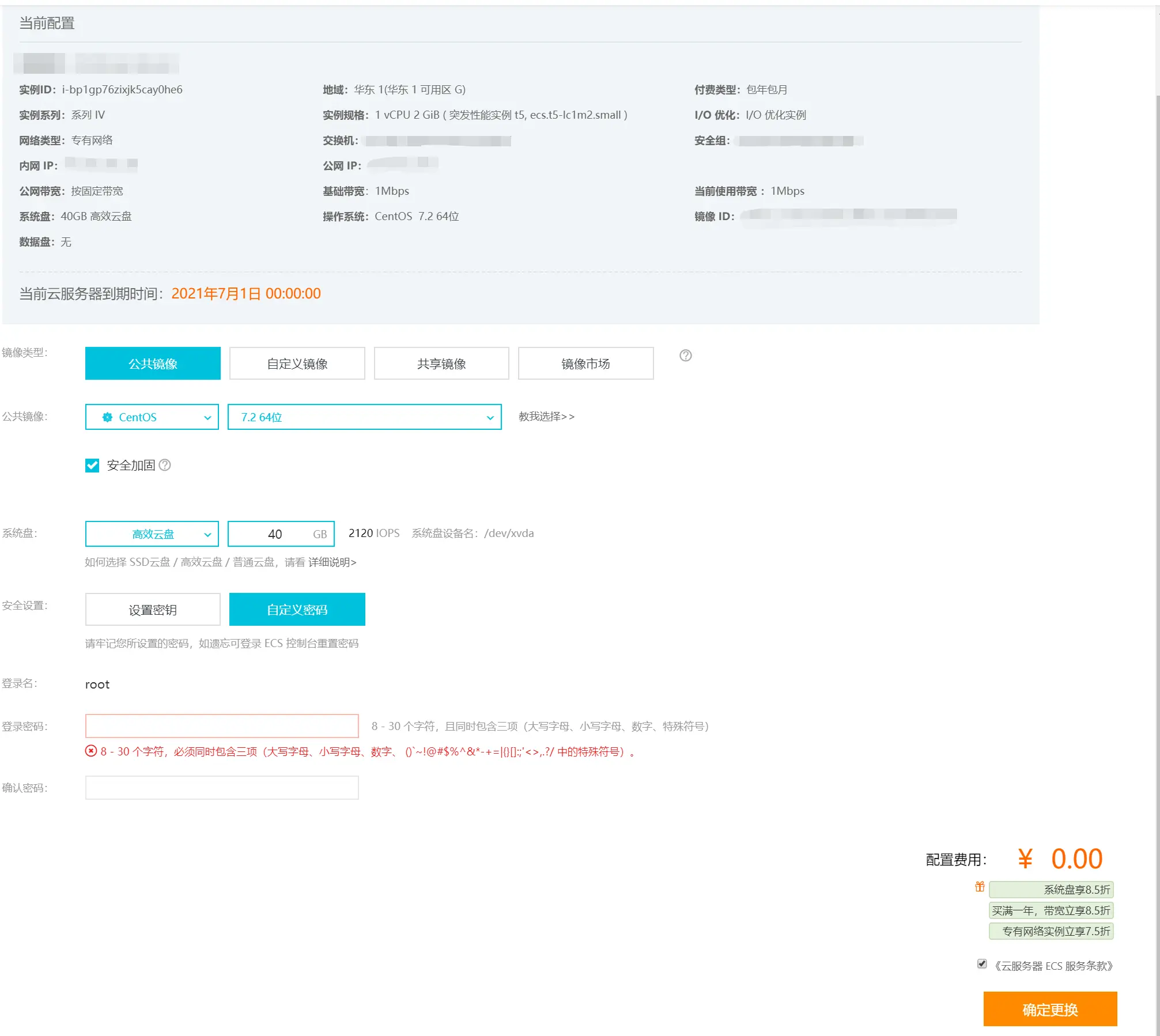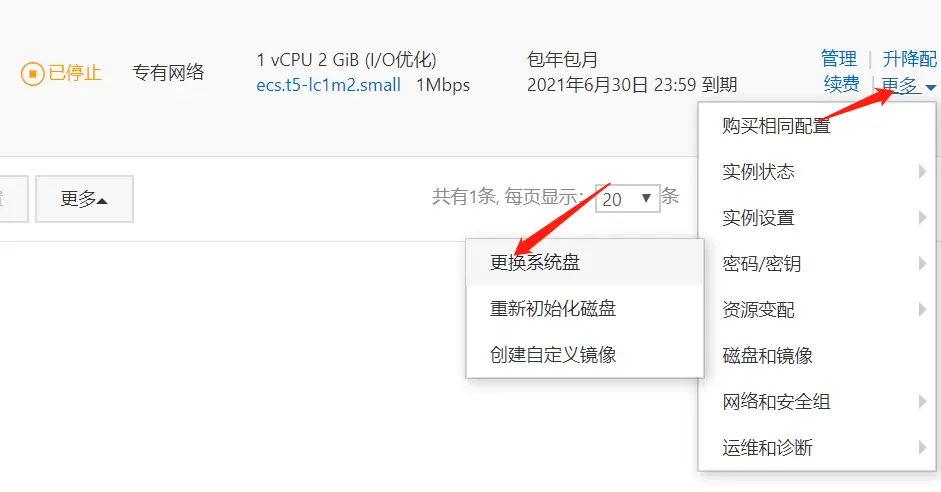 - 返回实例,找到更多 => 磁盘和镜像 => 更换系统盘