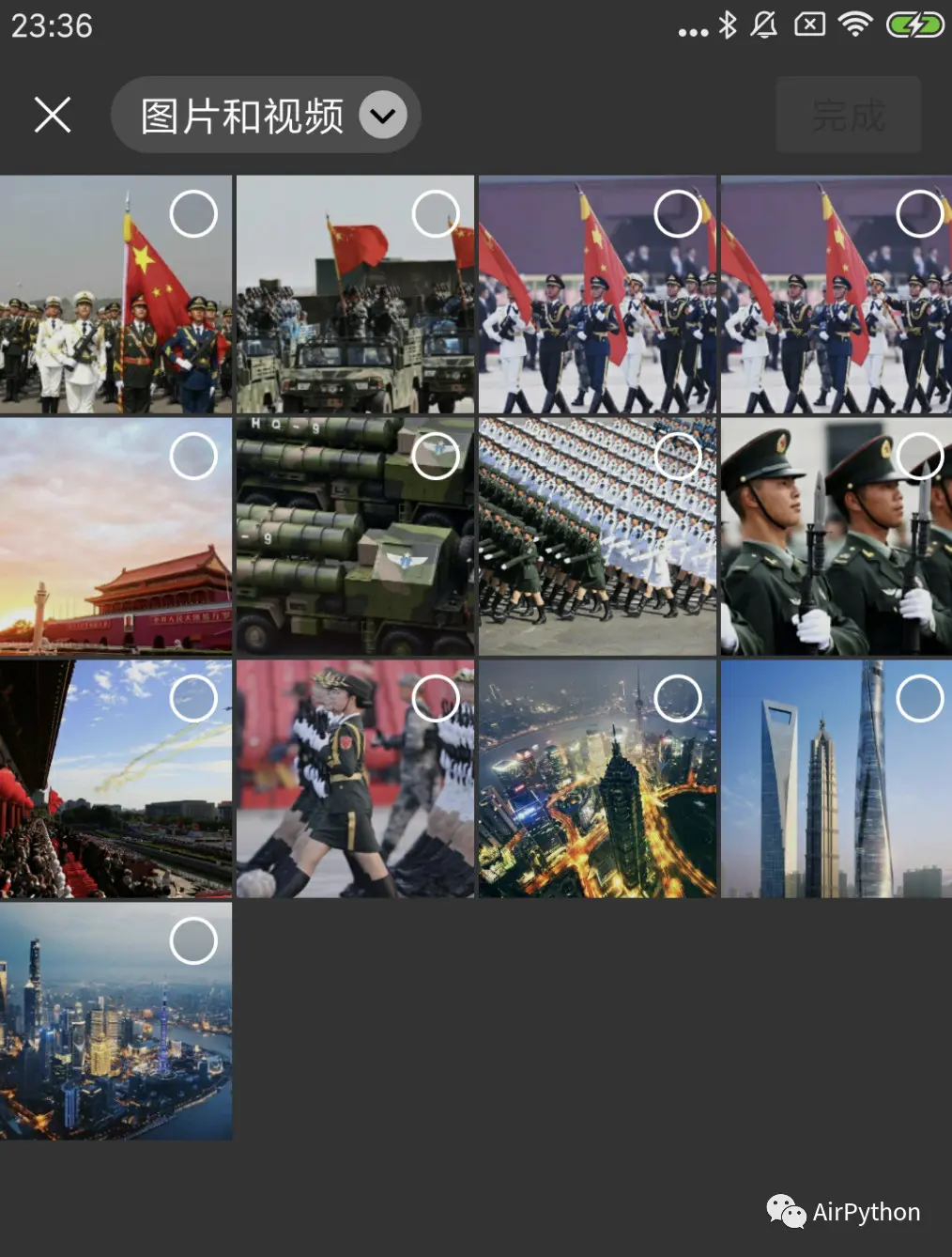 def __open_friend_circle(self): """ 打开朋友圈 :return: """ # 等待完全打开微信App self.poco(text='微信').wait_for_appearance() self.poco(text='通讯录').wait_for_appearance() self.poco(text='发现').wait_for_appearance() self.poco(text='我').wait_for_appearance() print('微信完全打开') # 点击【发现】Tab self.poco('com.tencent.mm:id/djv', text='发现').parent().click() # 打开朋友圈 self.poco('android:id/title', text='朋友圈').click() # 等待朋友圈动态加载完全 self.poco('com.tencent.mm:id/eyx').wait_for_appearance()第 5 步,从手机相册内选择图片。