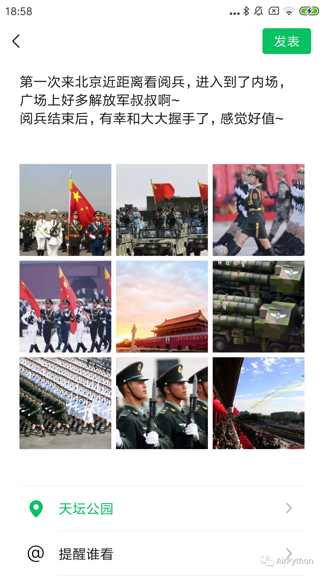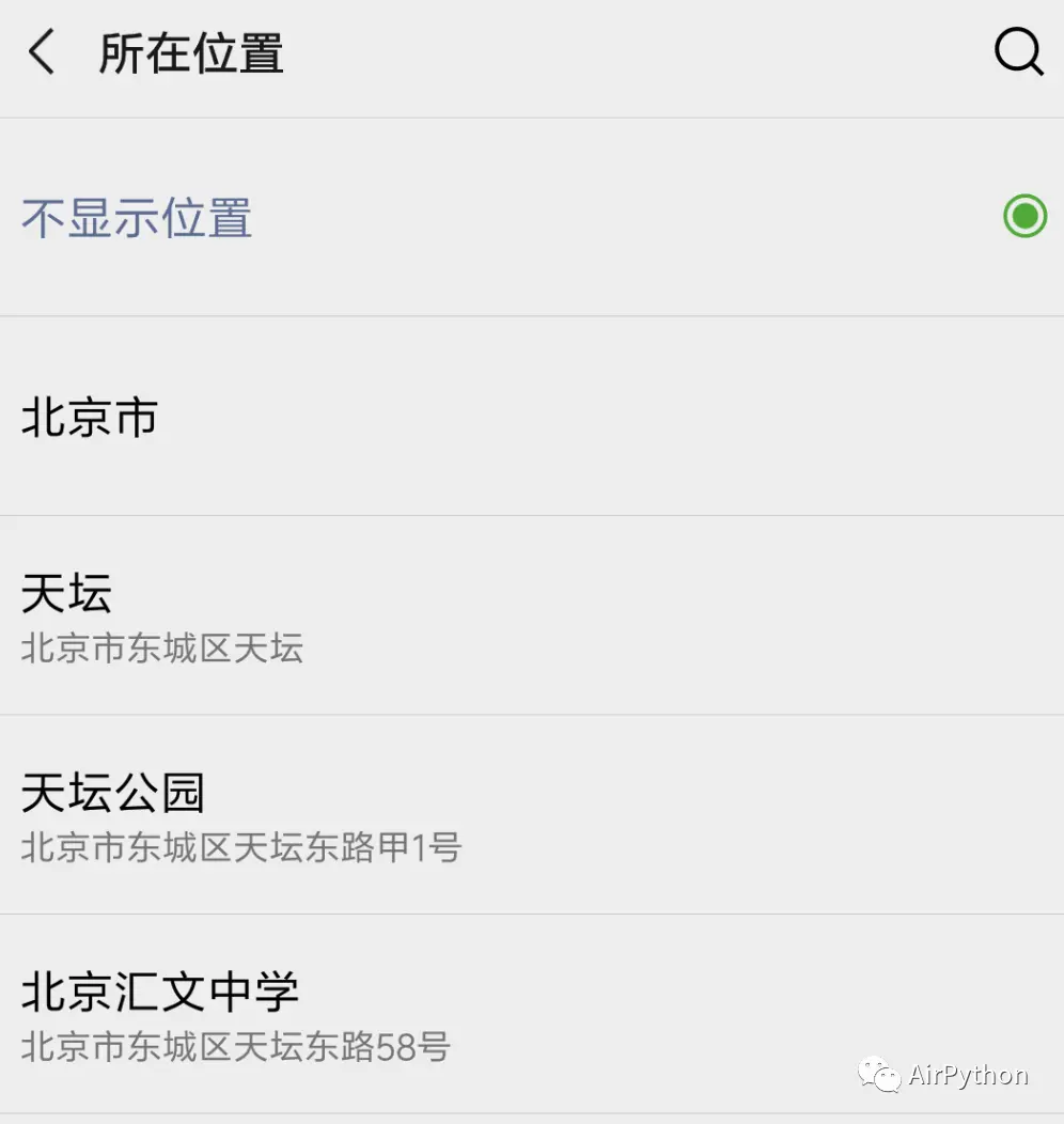def __put_content_and_gps(self): """ 输入内容和定位 :return: """ # 输入朋友圈内容 self.poco('com.tencent.mm:id/d3k').set_text(self.msg) # 定位的次数,一般需要两次 location_count = 0 # 点击定位图标 while True: self.poco('com.tencent.mm:id/d0a', text='所在位置').click() # 等待搜索列表中有结果出现 self.poco('com.tencent.mm:id/du7').wait_for_appearance() if location_count == 0: # 返回 keyevent('BACK') location_count += 1 else: # 排除ListView的前两项(不显示、市区),直接点击第三项(具体位置) self.poco('com.tencent.mm:id/dul').children()[2].click() break第 7 步,拿到顶部的发布按钮,就可以 一键发布动态了。